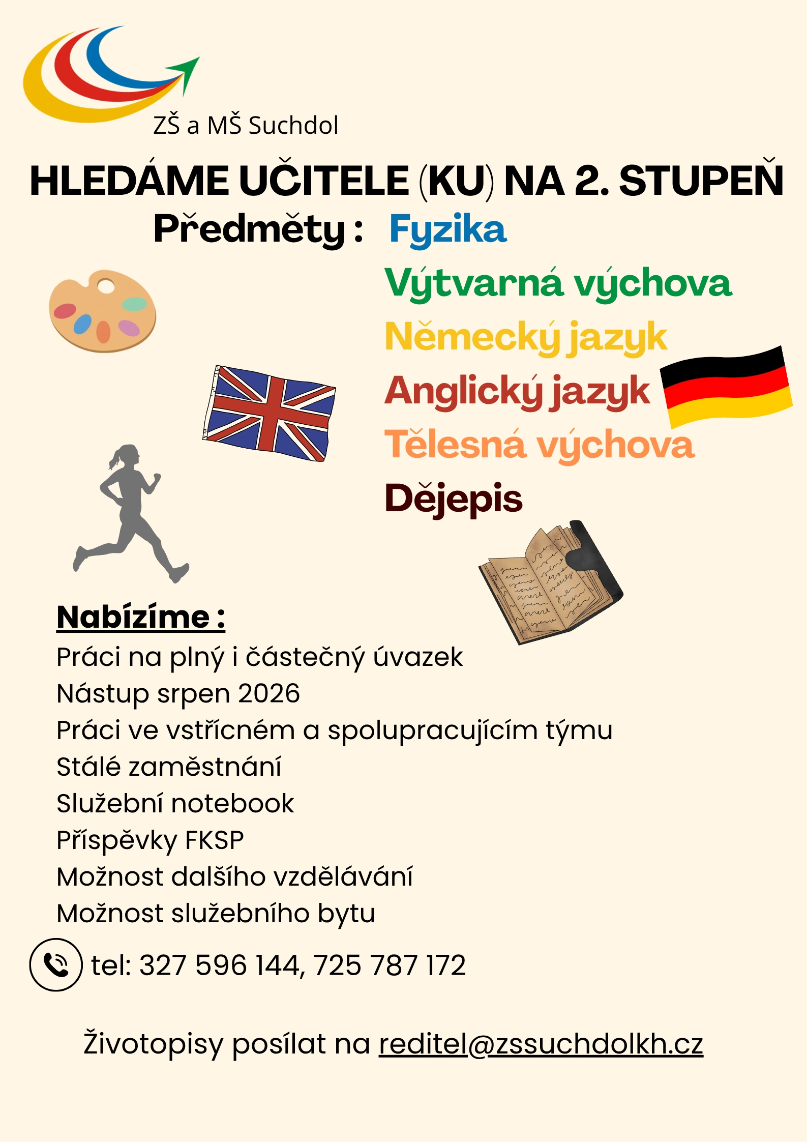 Vážení rodiče. Ředitelství Základní školy a Mateřské školy Suchdol oznamuje, že po domluvě se zřizovatelem, bude omezen provoz mateřské školy v době jarních prázdnin dne 2.4. 2026. Během této doby bude v provozu oddělení Myšek, Suchdol...